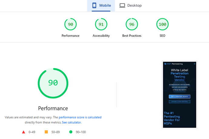 Mobile-first optimization was a priority. Using Webflow’s responsive design capabilities, MSP SEO Agency ensured MSP Pentesting’s site delivered a seamless experience across devices. Achieving a perfect SEO score (100) validated the technical foundation, while strong accessibility and best practices scores reinforced trust and usability.