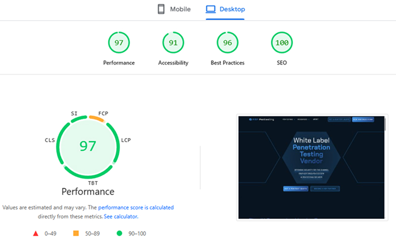 On desktop, MSP Pentesting’s site achieved near-perfect performance metrics. Fast load times (FCP: 1.0s, LCP: 1.0s) and minimal layout shift (CLS: 0.003) highlight the effectiveness of Webflow’s clean codebase and MSP SEO Agency’s optimization strategy. These results ensure both users and search engines experience a frictionless site.